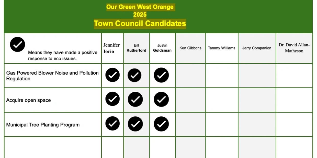 West Orange's tree canopy has dropped from 30% to 27%, and neighborhoods are experiencing severe flooding. This November, seven candidates are running for Town Council. Their answers to the Sierra Club/Our Green West Orange questionnaire reveal clear differences in commitment and experience.